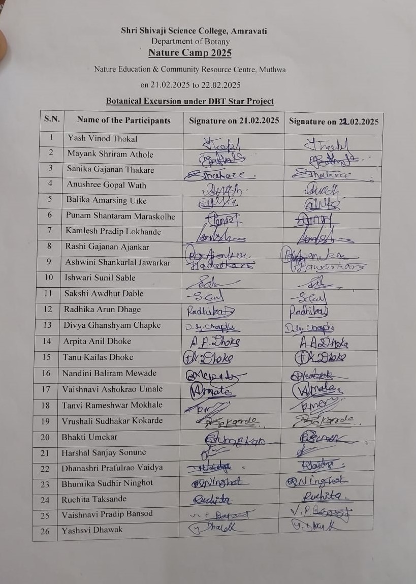 In line with its commitment to holistic and experiential learning, the Department of Botany, Shri Shivaji Science College, Amravati, organized a two-day Nature Camp 2025 under the DBT Star College Scheme. Held on 21st and 22nd February 2025, this educational excursion aimed at introducing first-year B.Sc. Botany students to the ecological richness of Melghat — a region known for its diverse flora, unique ecosystem, and tribal heritage.