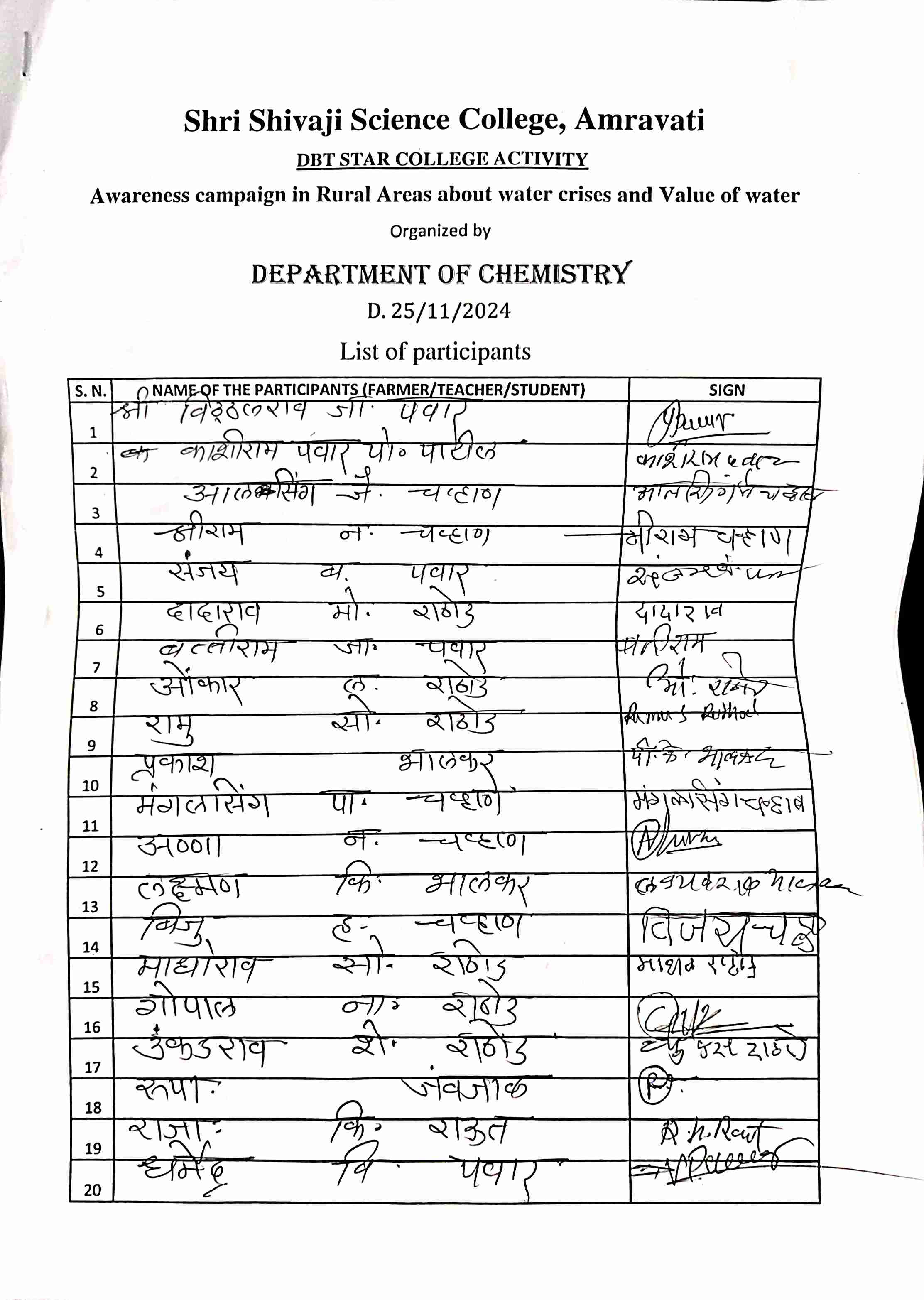 Guest lecture for farmers, teachers and students (2024-25) was organized by Department of Chemistry on the topic of “Awareness campaign in Rural Areas about water crises and value of water” on Monday 25th November 2024 under the guidance of Dr. G.V. Korpe, Principal, Shri Shivaji Science College, Amravati, Dr. P.R. Mandlik, Head, Department of Chemistry, Dr. D.D. Khedkar ,Coordinator , DBT Star Project. Dr. S. A. Wadhal. And Dr. N.A. Kalambe, organizing Committee members. Mr. Milind Malve and Mr. Sudhakar Pawar worked hard for the success of this program.