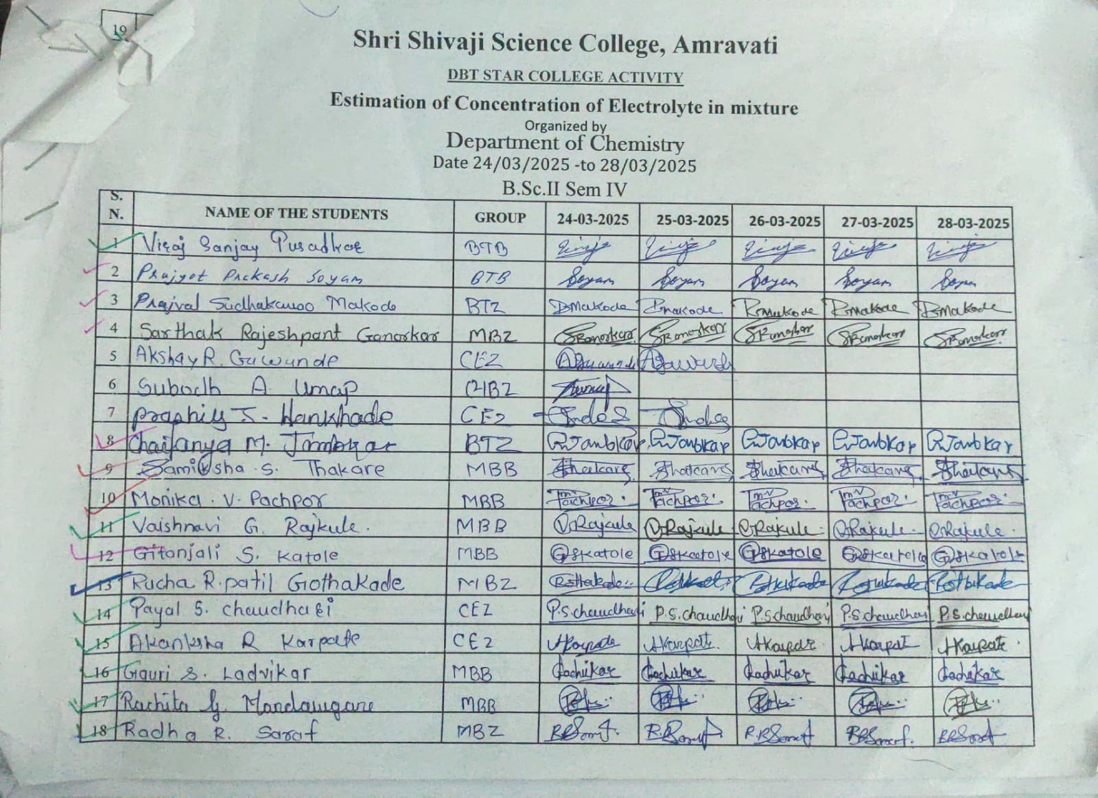 Introduction: The Department of Chemistry at Shri Shivaji Science College, Amravati, successfully organized a five-day DBT Star College Activity aimed at Estimation of concentration of electrolytes in mixtures. By performing experiments to estimate the concentration of electrolytes, students gain a practical understanding of how these solutions behave and how their concentration can be determined. They learn about various analytical techniques and the importance of electrolytes in different applications, from chemistry to biology and medicine.