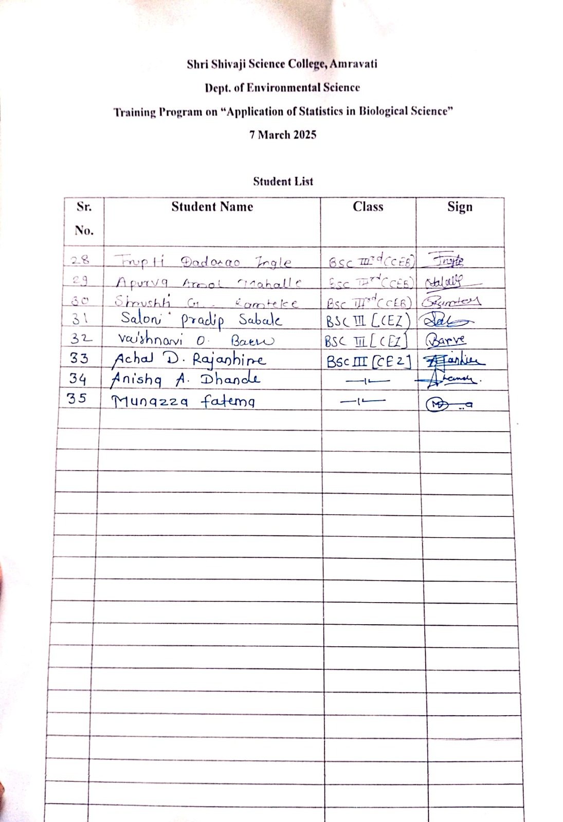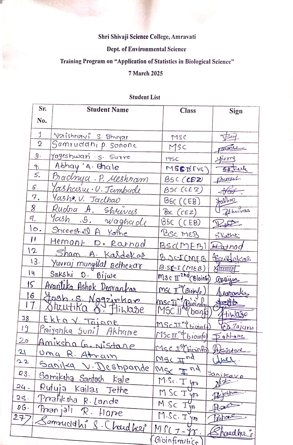 Department of Environmental Science, Shri Shivaji Science College, Amravati organized Training program on “Application of Statistic in Biological Sciences” under DBT STAR college scheme on 7th March 2025 in A. V. Theatre of the college.The program aimed to equip students of U.G. with statistical concepts applicable in biological research, to cover the topics of statistics included in their syllabus and highlight its practical applications in various subjects of Biological Sciences. Training program includes guest lecture and the hands on sessions.