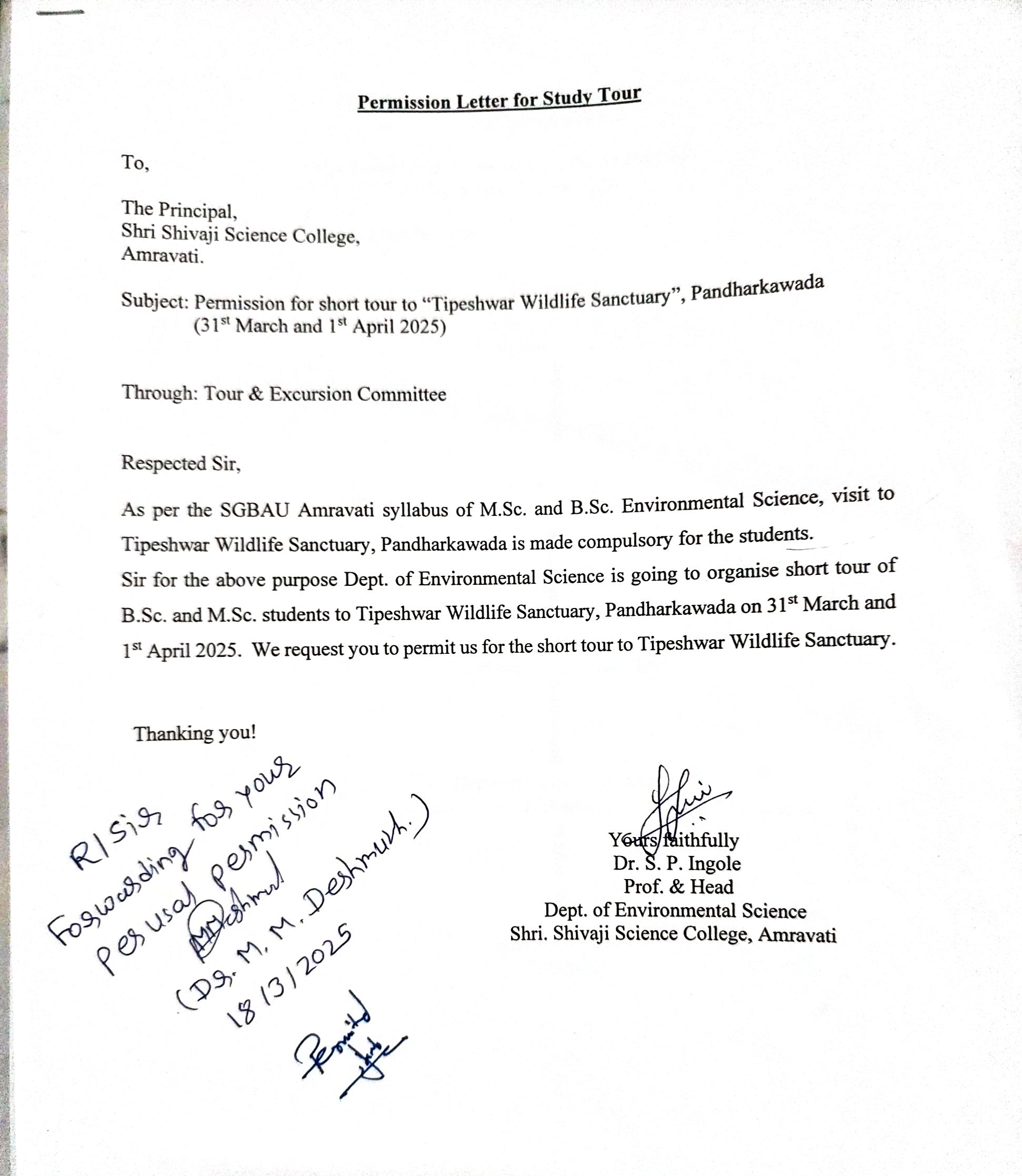 The Department of Environmental Science, Shri Shivaji Science College, Amravati, organized a two-day educational tour to Tipeshwar Wildlife Sanctuary, located in the Yavatmal district of Maharashtra, on 31st March and 1st April 2024. The tour was conducted under the DBT Star College Scheme of the Department of Biotechnology, Government of India, which encourages practical and research-oriented learning among undergraduate science students.