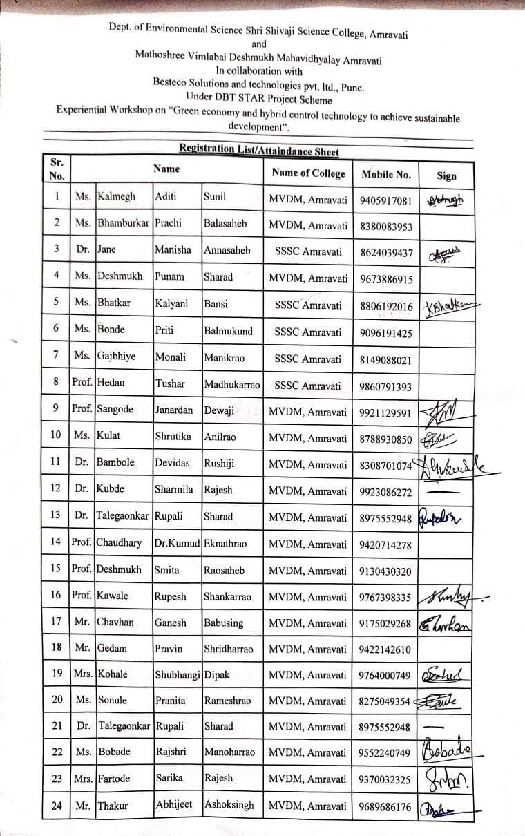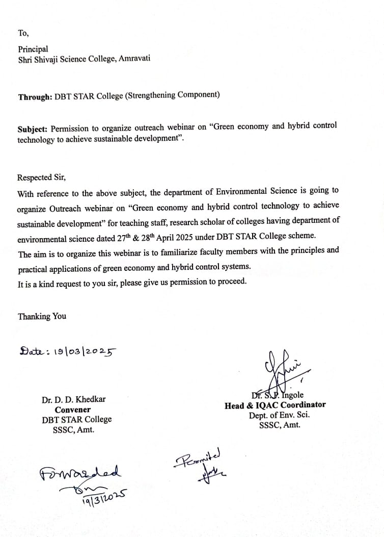 The Department of Environmental Science of Shri Shivaji Science College, Amravati, and Matoshree Vimlabai Deshmukh Mahavidyalaya, Amravati, jointly organized a two-day national webinar titled “Green Economy and Hybrid Control Technology to Achieve Sustainable Development” on 27th and 28th April 2025. The event was conducted in collaboration with Besteco Solutions and Technologies Pvt. Ltd., Pune, under the sponsorship of the DBT STAR Project Scheme, an initiative of the Department of Biotechnology, Government of India.