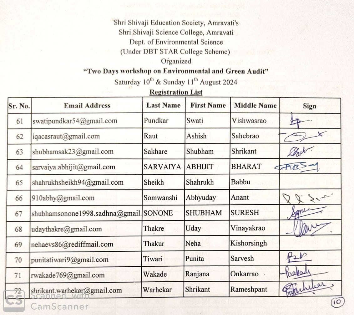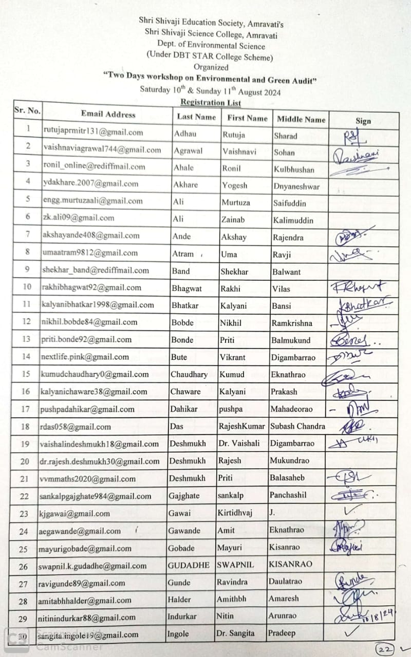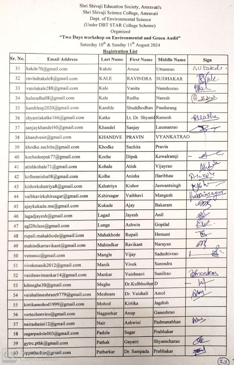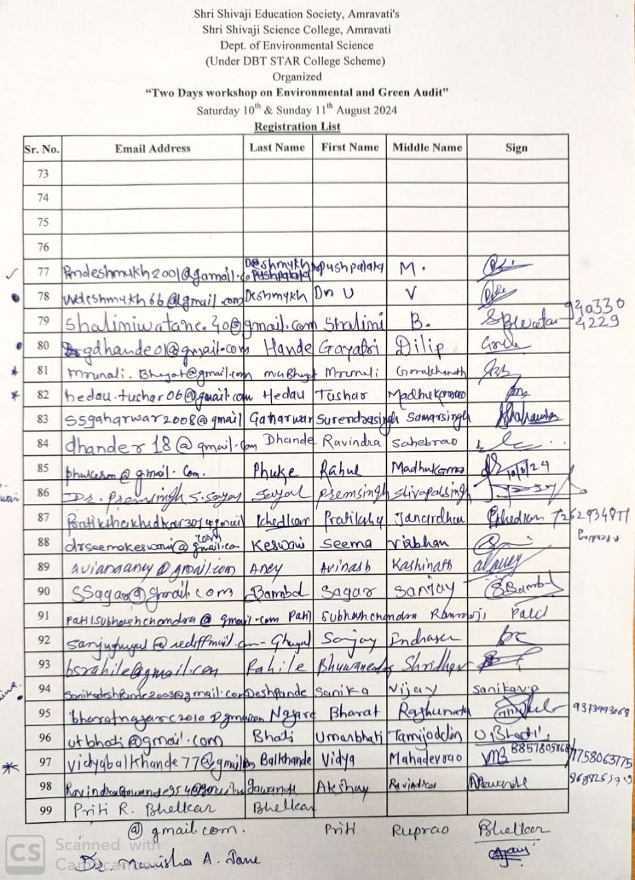 “Two Days workshop on Environmental and Green Audit” for teaching staff of colleges under Shri Shivaji Education Society and colleges of Amravati city dated 10th & 11th August 2024 was organized by dept. of Environmental Science under DBT STAR College scheme. The aim is to organize this workshop is to provide basic knowledge and awareness about the Green, Environment (Air, Water, Soil, Noise) and Energy audit required for NAAC assessment process and also for the sustainability of environment.