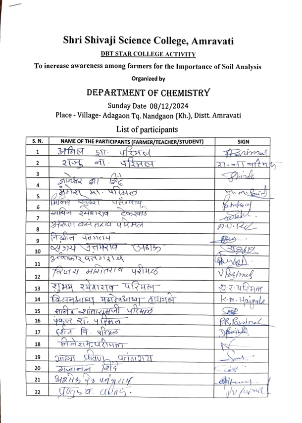 Guest lecture for farmers, teachers and students (2024-25) was organized by Department of Chemistry on the topic of “To increase Awareness among farmers for the importance of soil analysis to check Micronutrient status of soil” on Sunday 8th December 2024 at Vitthal Rukhmini Mandir Adgaon, under the guidance of Dr. G.V. Korpe, Principal, Shri Shivaji Science College, Amravati, Dr. P.R. Mandlik, Head, Department of Chemistry, Dr. D.D. Khedkar, Coordinator, DBT Star Project. Dr. N. R. Thakare and Dr. N. H. Bansod, Convener. Mr. Milind Malve worked for the success of this program.