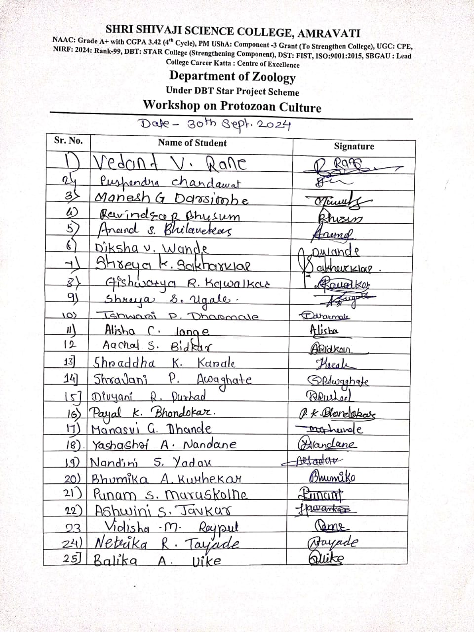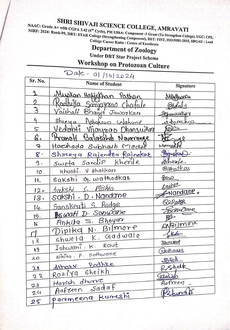 Shri Shivaji Science College, Amravati is making its valuable contribution in creating bright citizens by achieving the comprehensive development, heritage and cultural progress of the country. Continuing this tradition, Department of Zoology organized Two days workshop on the topic of "Protozoan culture" for B.Sc. I Students (2024-25) from dated 30thSeptember to 1st October2024 under the guidance of Dr. G.V. Korpe, Principal, Shri. Shivaji Science College, Amravati, Dr. J. D. Dhote, Head, Department of Zoology , Dr. D.D. Khedkar, Coordinator, College DBT Star Project, Dr. G. A. Wagh, Coordinator Department DBT Star Project, Dr. S. V. Gawande organizing Committee member. All the Respected faculty members of Department of Zoology were present for this programme.
