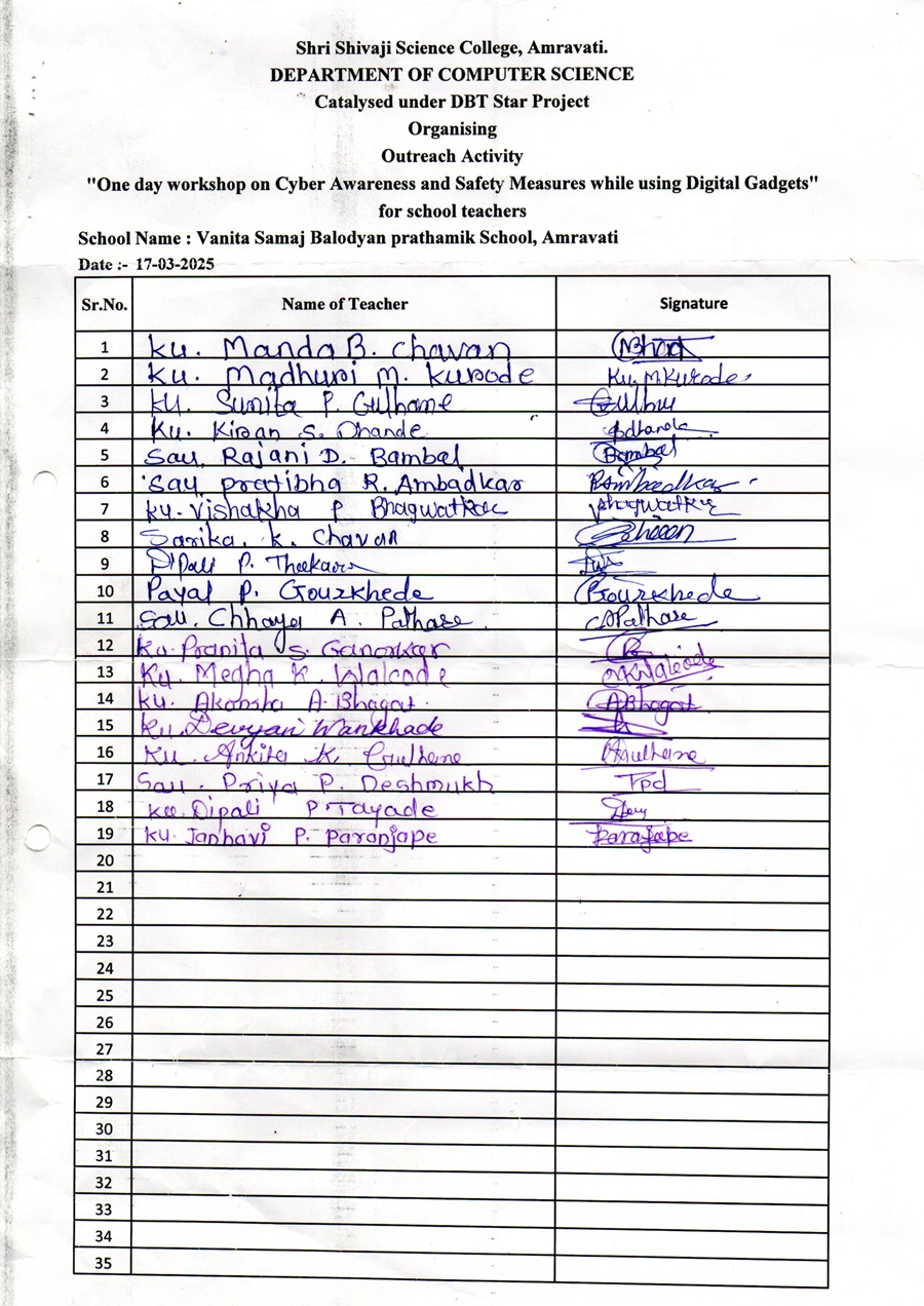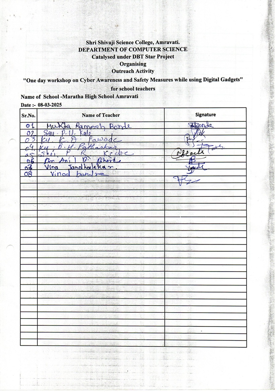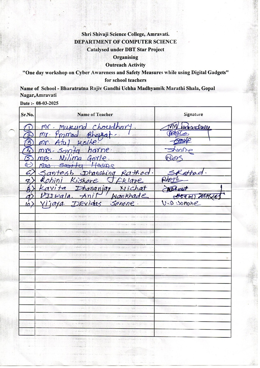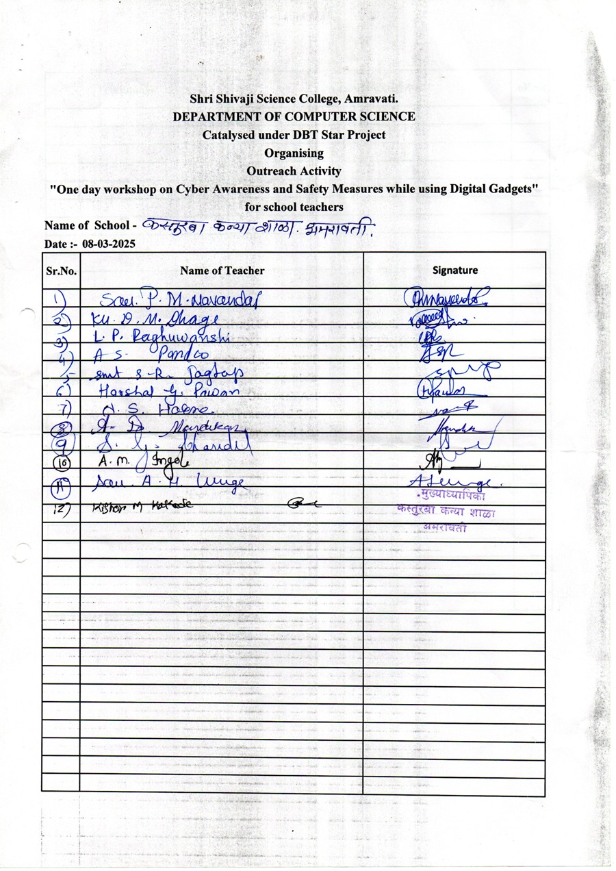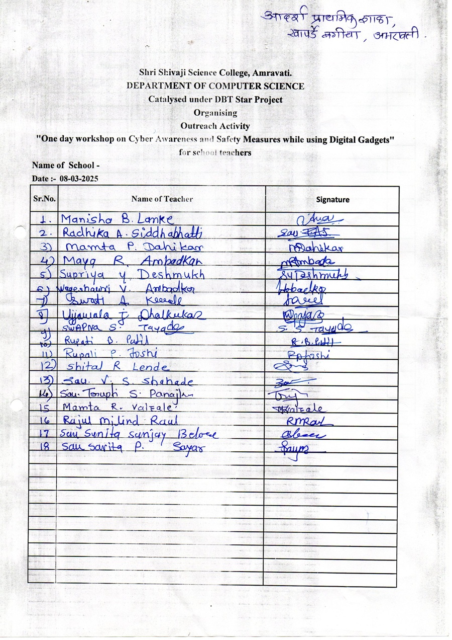 The outreach activity organized by the Department of Computer Science on the topic “Workshop on Cyber Awareness & Safety Measures while Using Digital Gadgets” commenced with a formal Inaugural Session held on 8th March, 2025 and 15th March, 2025 across six different schools in Amravati city. The initiative, catalysed under the DBT Star College Project, aimed to empower school and college teachers with essential knowledge and practical skills to ensure safe and responsible use of digital technology.