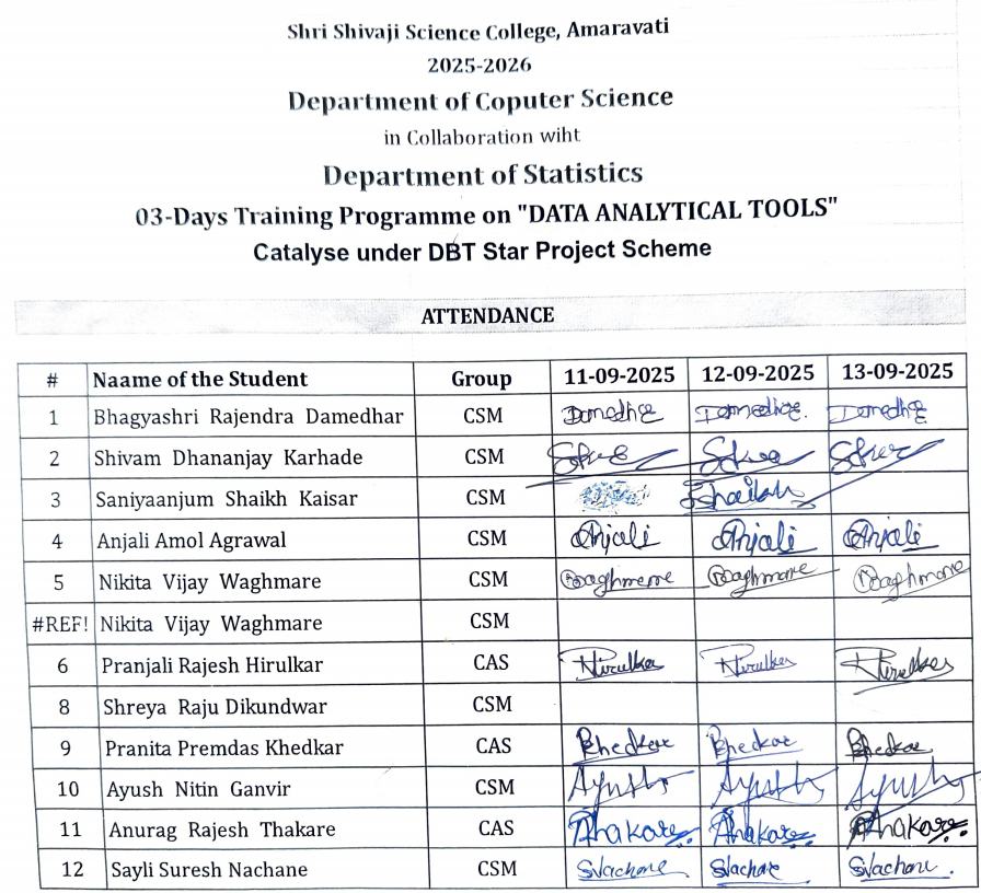 The Department of Computer Science, in collaboration with the Department of Statistics, Shri Shivaji Science College, Amravati, successfully organized a Three-Day Training Program on “Data Analytical Tools” from 11th to 13th September 2025. The program was conducted in association with the Research and Incubation Foundation, SGBAU, Amravati, and Inexgdata Technologies Pvt. Ltd., Pune, catalyzed under the DBT Star College Scheme (Strengthening Component).
