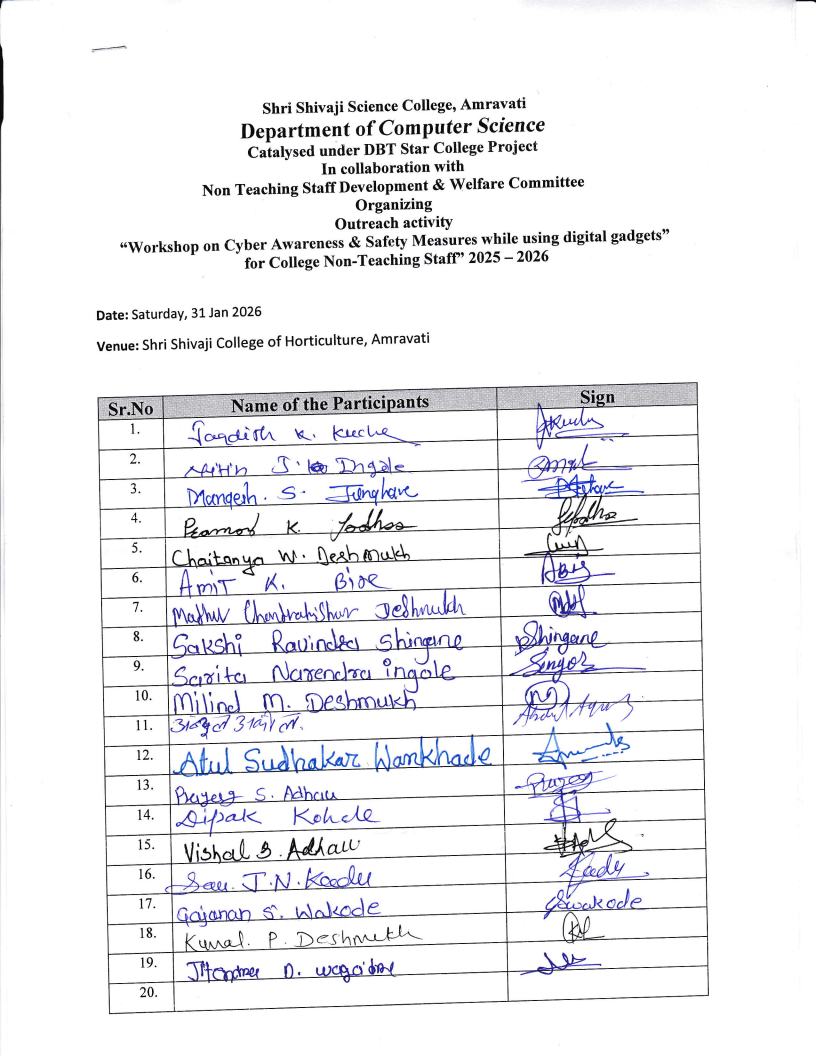 The workshop was organized by the Department of Computer Science, Shri Shivaji Science College, Amravati, under the DBT Star College Scheme (Strengthening Component), in collaboration with the Non-Teaching Staff Development and Welfare Committee (NTSDC).