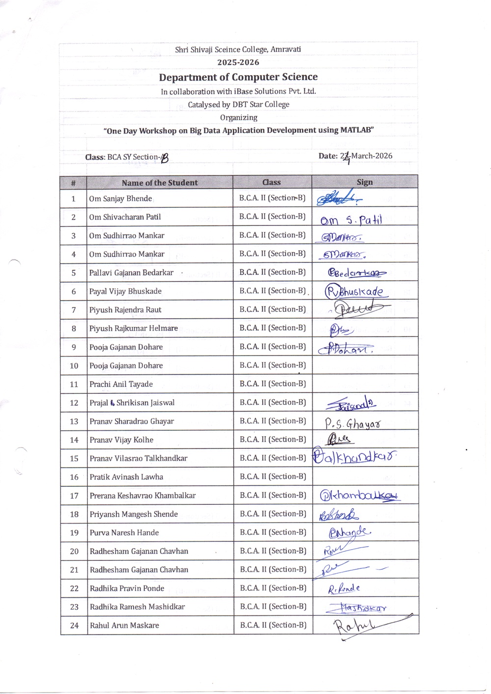 A total of 103 students from BCA Second Year Section-B actively participated in the workshop. The event provided a platform for students to enhance their understanding of big data and to develop practical skills in MATLAB. The structured sessions, combined with hands-on activities, created an engaging and interactive learning environment. The workshop also helped bridge the gap between academic learning and industry requirements, making it highly relevant for the participants.