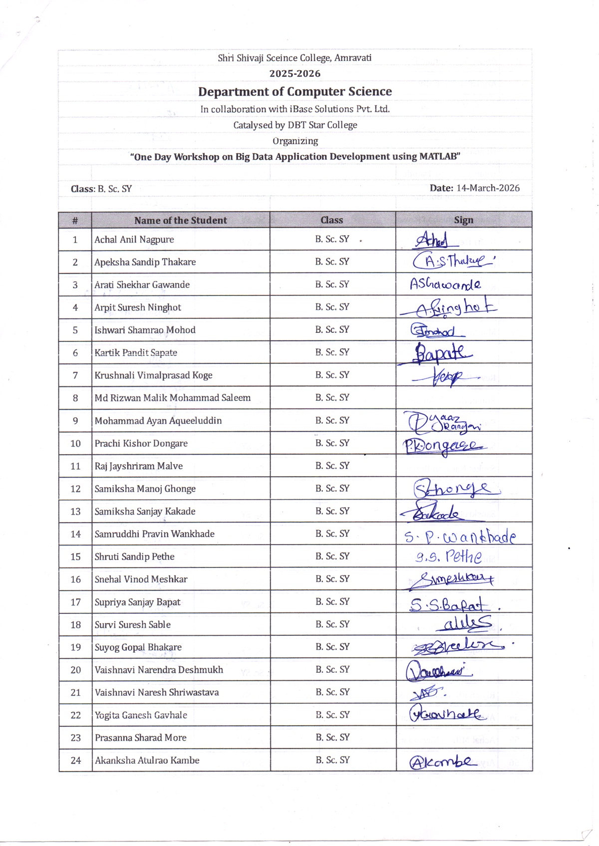 A total of 143 students from B.Sc. Second Year actively participated in the workshop. The event provided a platform for students to enhance their understanding of big data and to develop practical skills in MATLAB. The structured sessions, combined with hands-on activities, created an engaging and interactive learning environment. The workshop also helped bridge the gap between academic learning and industry requirements, making it highly relevant for the participants.