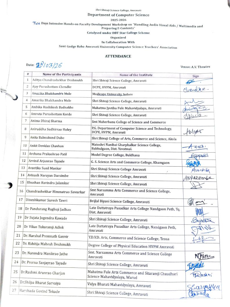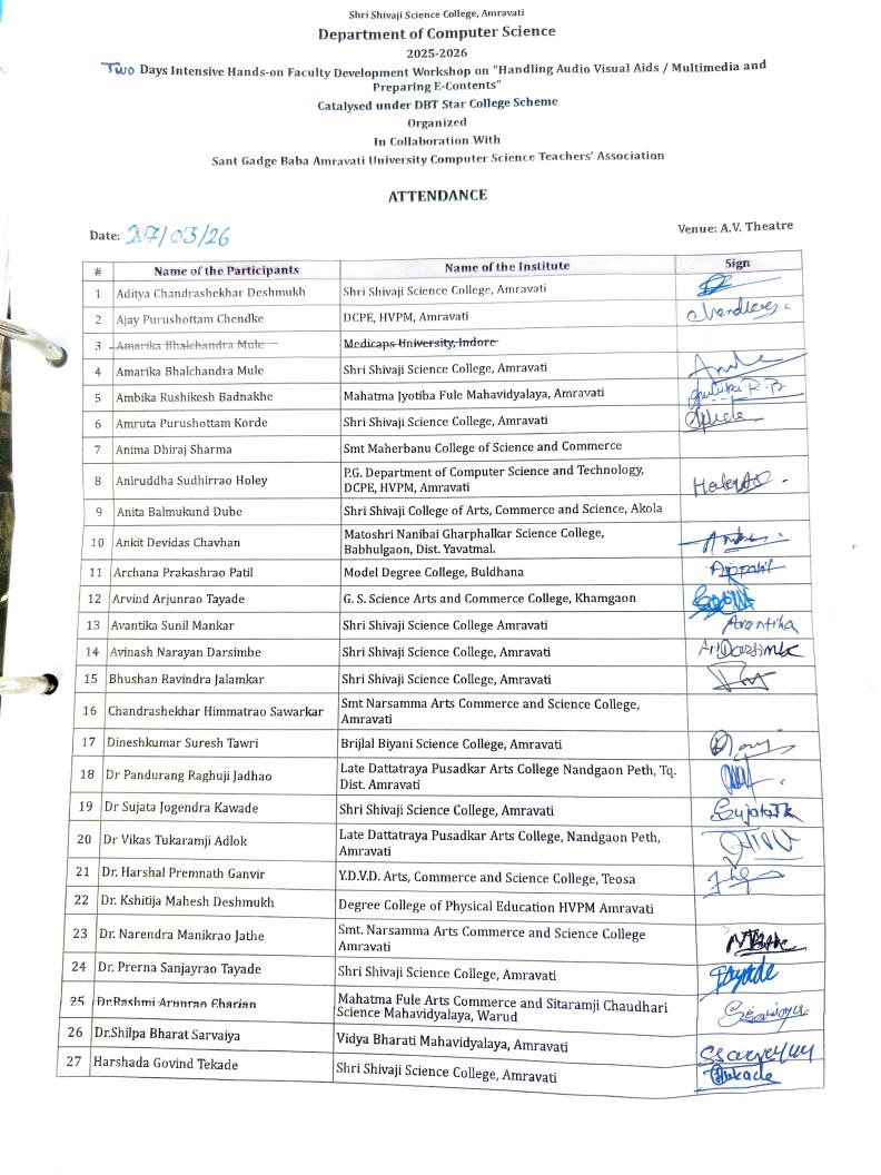 The Department of Computer Science & Application at Shri Shivaji Science College, Amravati successfully organized a Two-Day Intensive Hands-on Faculty Development Workshop on the theme “Handling Audio Visual Aids / Multimedia and Preparing E-Contents” on 27th and 28th March 2026. The workshop was conducted under the DBT Star College Scheme and aimed at enhancing the teaching competencies of faculty members in the digital era.