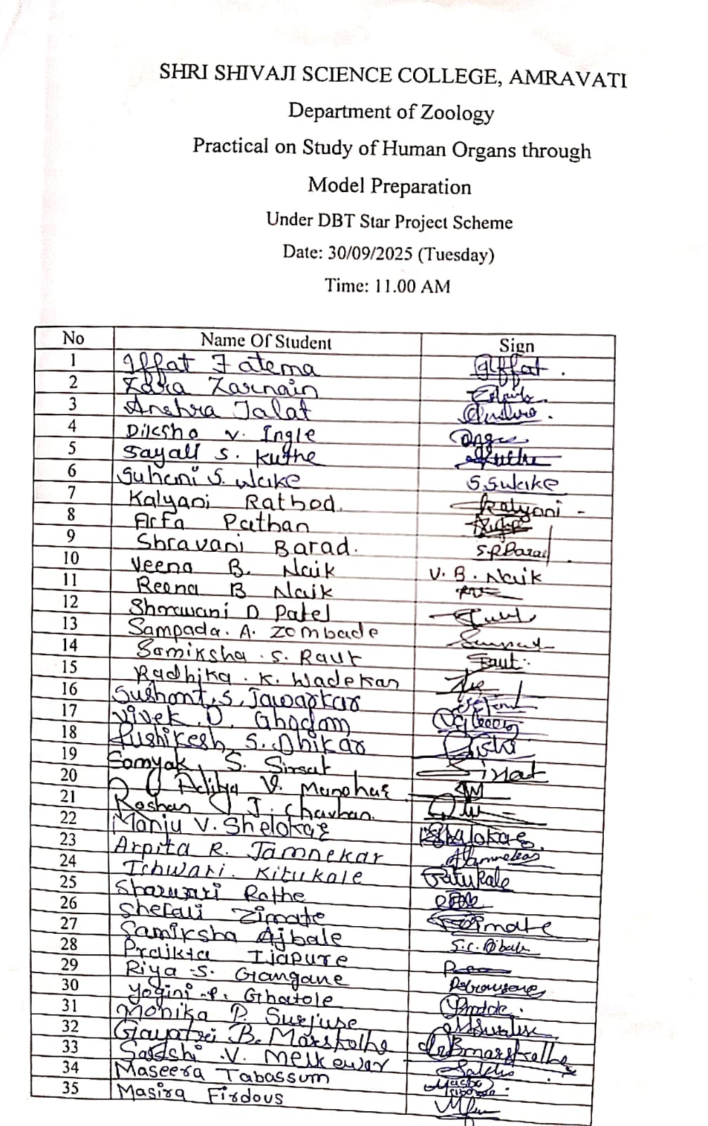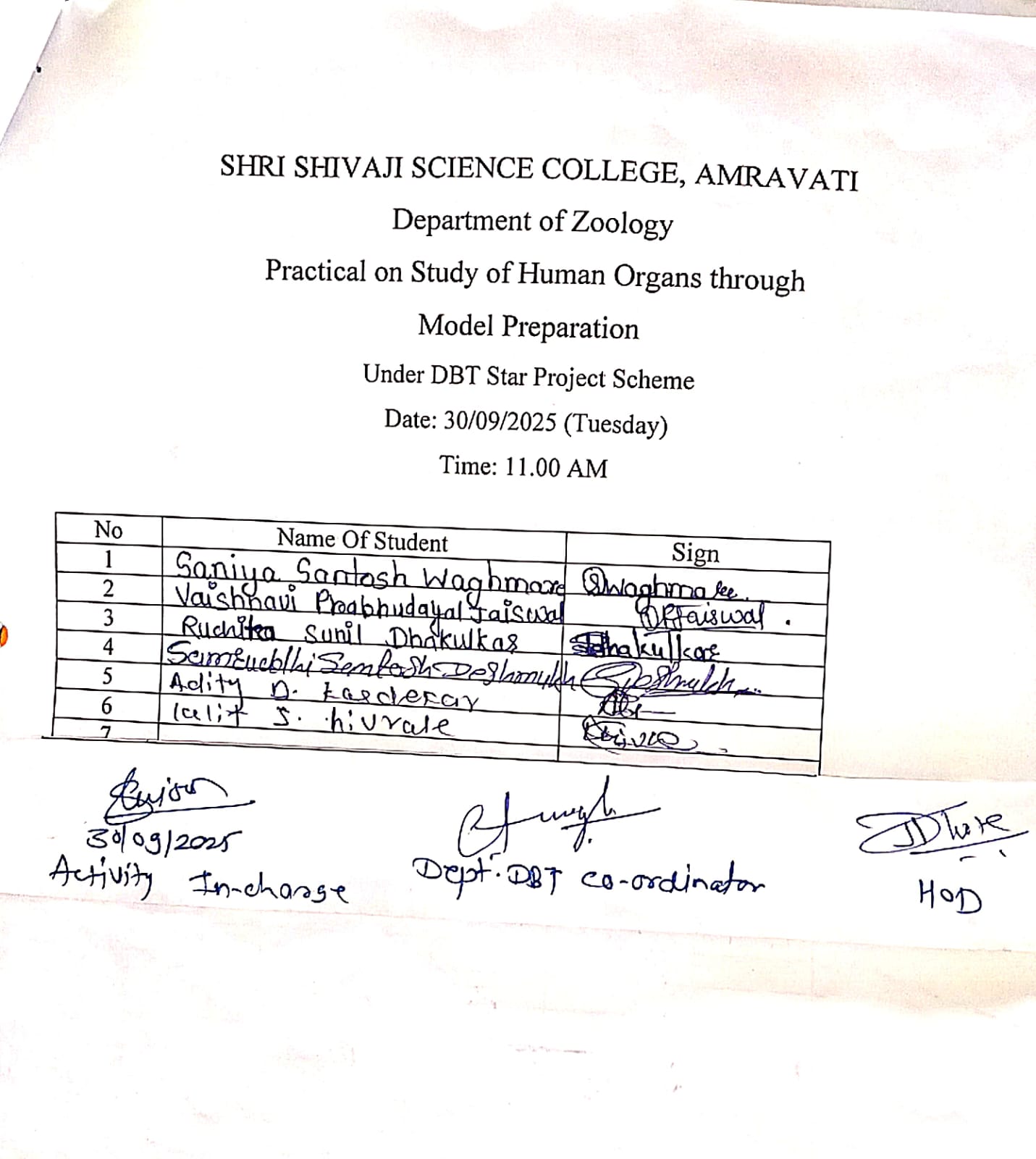 The Department of Zoology, Shri Shivaji Science College, Amravati, organized a practical activity titled “Study of Human Organs through Model Preparation” on 30th September 2025 (Tuesday) at 11:00 AM under the DBT Star College Scheme. The activity was conducted for B.Sc. III Year students with the guidance of Activity In-charge Dr. S. V. Gawande. The program was supported by the Head of the Department, Dr. J. D. Dhote, and coordinated under the Department DBT Coordinator by Dr. G. A. Wagh.