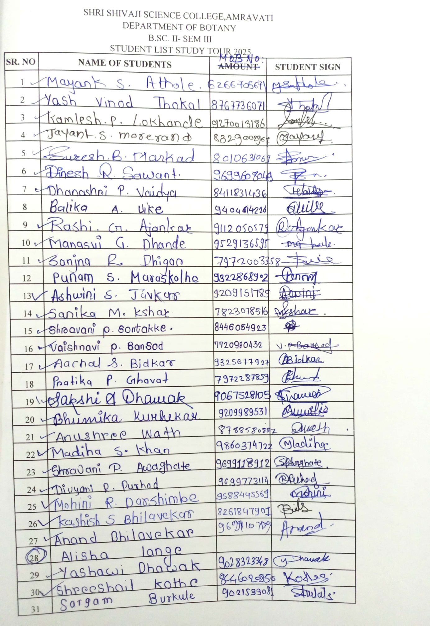 The Department of Botany, Shri Shivaji Science College, Amravati, successfully organized a Botanical Excursion to Amzari, East Melghat (Dist. Amravati) on 23rd September 2025 for the students of B.Sc. II (Semester IV). This excursion was designed as an integral component of the academic curriculum with the objective of providing experiential and field-based learning opportunities beyond the traditional classroom environment.