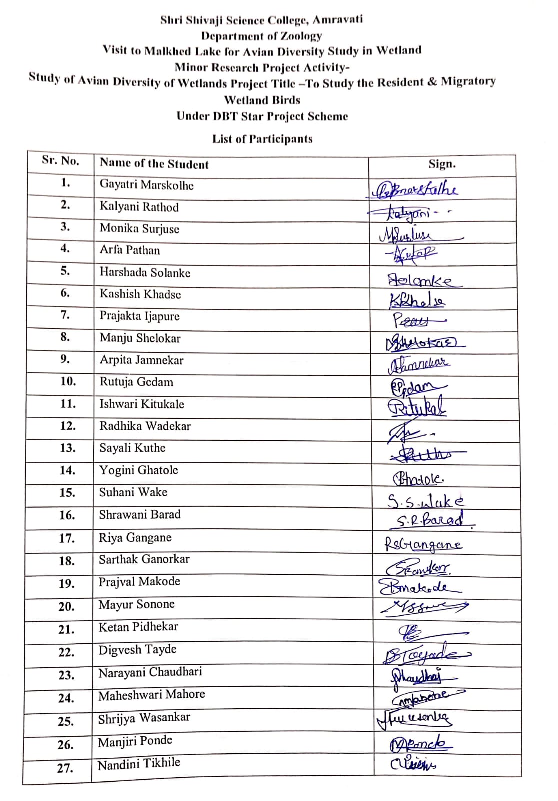 This Minor research project activity on “Study of Avian Diversity of Wetlands Project Title –To Study the Resident & Migratory Wetland Birds” was organized and conducted under the guidance of Dr. J. D. Dhote, Prof. & Head, Department of Zoology and Dr. G. A. Wagh, Prof. & Departmental DBT Coordinator, Dr. A. R. Rajoria, Asstt. Prof. & Activity Incharge and teaching and non-teaching staff of department of Zoology.