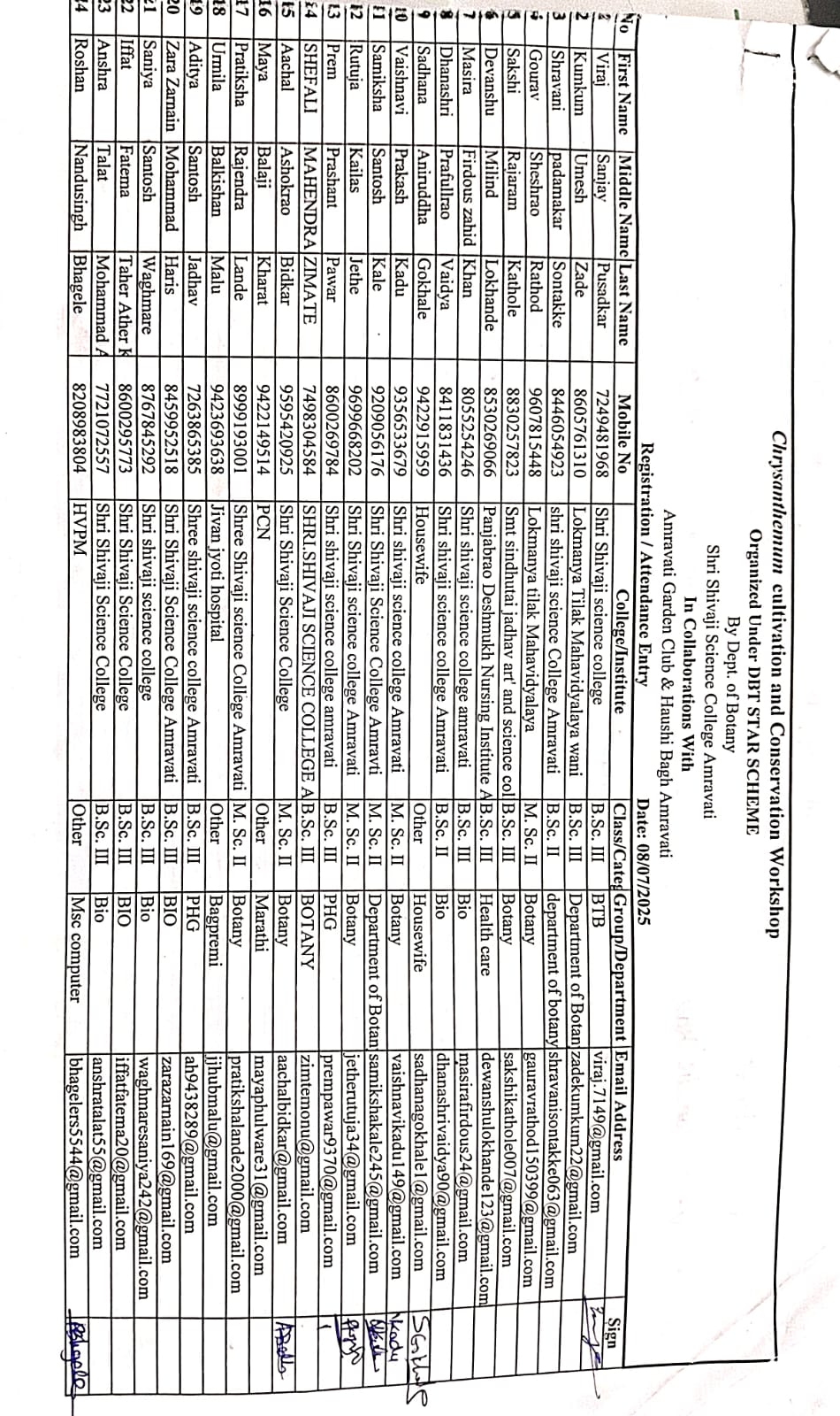 A Chrysanthemum Cultivation and Conservation Workshop was successfully organized on 7 August 2025 by the Department of Botany, Shri Shivaji Science College, Amravati, in collaboration with the Amravati Garden Club and Amravati Houshi Bagh (Amateur Gardeners Association). The workshop was conducted under the DBT Star Scheme, with the objective of promoting horticultural skills, creating awareness about chrysanthemum cultivation, and encouraging students and citizens to adopt gardening as a sustainable and enriching hobby.