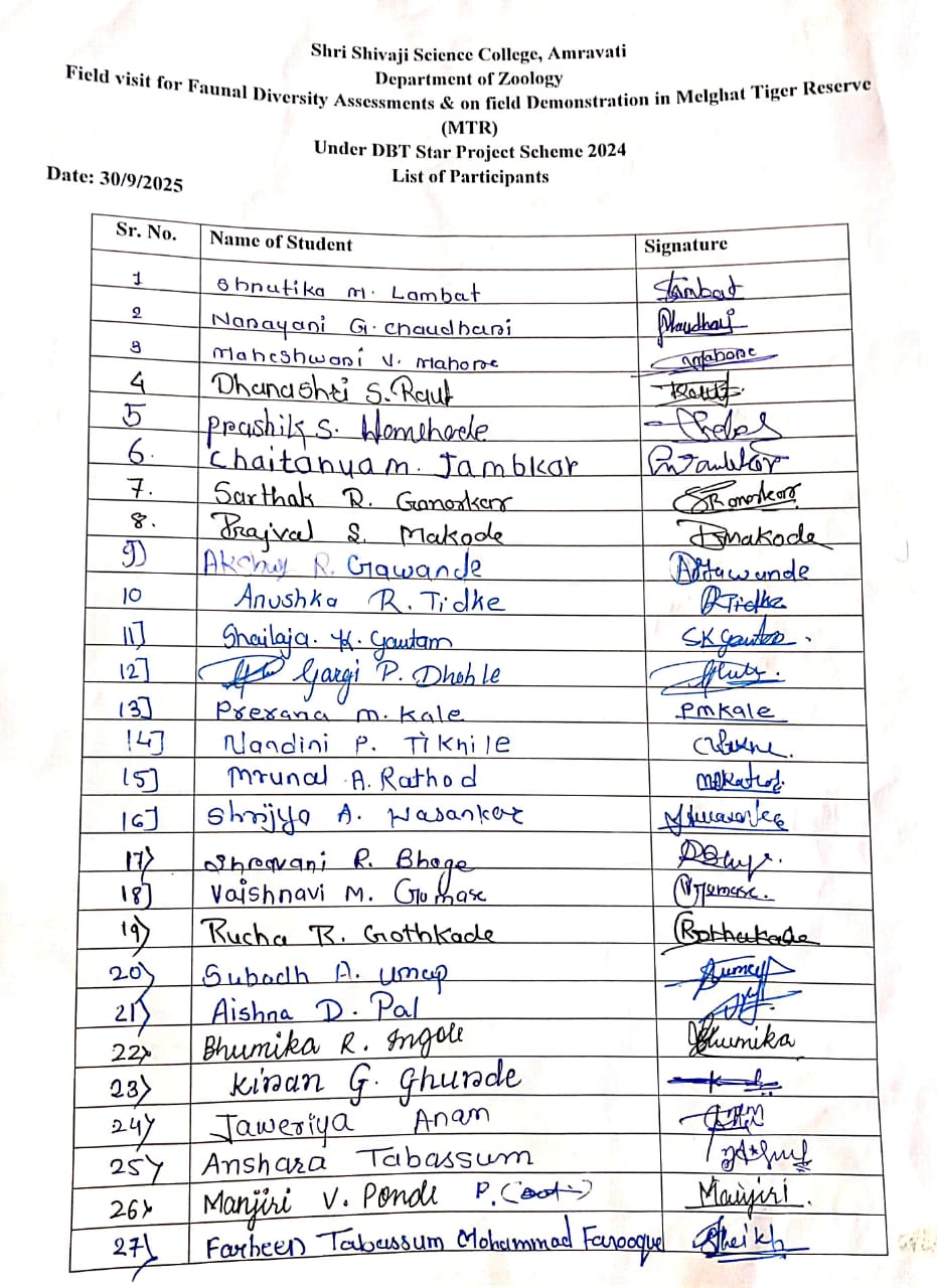 Field visit program for undergraduate students was organized on 30/9/2025 at Semadoh, Melghat Tiger Reserve undergraduate students on Faunal Diversity Assessments & on field demonstration. This visit was organized and conducted by Department of Zoology and catalyzed by DBT Star Project Scheme 2024 and as per university curriculum.