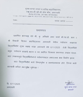 With this purpose, a B.Sc. III student from the Department of Environmental Science, Shri Shivaji Science College, Amravati organized an outreach activity at Nootan Kanya School, Amravati. The activity focused on promoting environmental awareness through a drawing competition and interactive discussion. Students enthusiastically participated and expressed their environmental ideas through art.