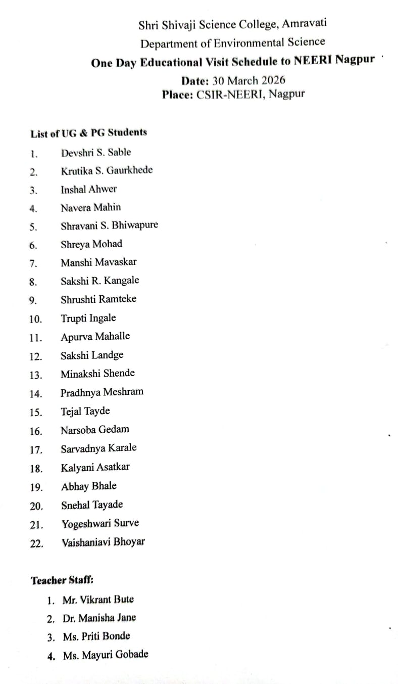 A one-day educational visit was organized by the Department of Environmental Science, Shri Shivaji Science College, Amravati, for B.Sc. First Year students on 30 March 2026 to CSIR-NEERI and Raman Science Centre, Nagpur. The visit was planned as a part of experiential learning to provide students with practical exposure to environmental science concepts and scientific advancements. A total of 21 students enthusiastically participated in this academic activity under the guidance of faculty members.