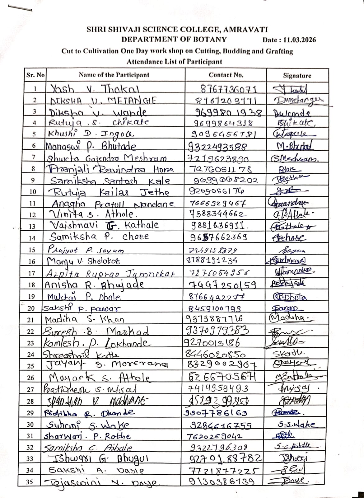 The Department of Botany, Shri Shivaji Science College, Amravati, organized a one-day workshop titled “Cut to Cultivation – One Day Workshop on Cutting, Budding and Grafting” on 11th March 2026, from 12:00 PM to 5:00 PM at the AV Theatre under the DBT STAR College Scheme. The workshop aimed to provide students with practical knowledge and hands-on experience in essential plant propagation techniques widely used in horticulture and agriculture.