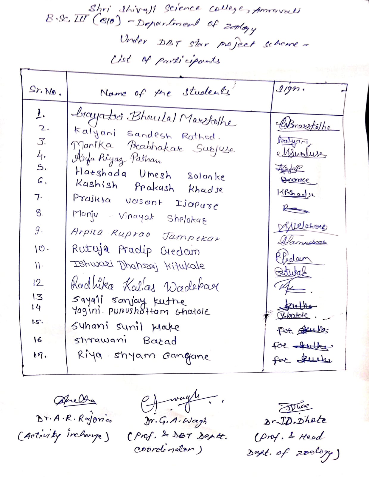 This activity was successfully organized and conducted under the guidance of Dr. J. D. Dhote, Prof. & Head, Department of Zoology and Dr. G. A. Wagh, Prof. & Departmental DBT Coordinator, Dr. A. R. Rajoria, Asstt. Prof. & Activity Incharge, Dr. G. D. Hande, Dr. S. V. Gawande, Dr. S. J. Kawade, Dr. P. M. Ramteke, Asstt. Prof. and non-teaching staff of department of Zoology.