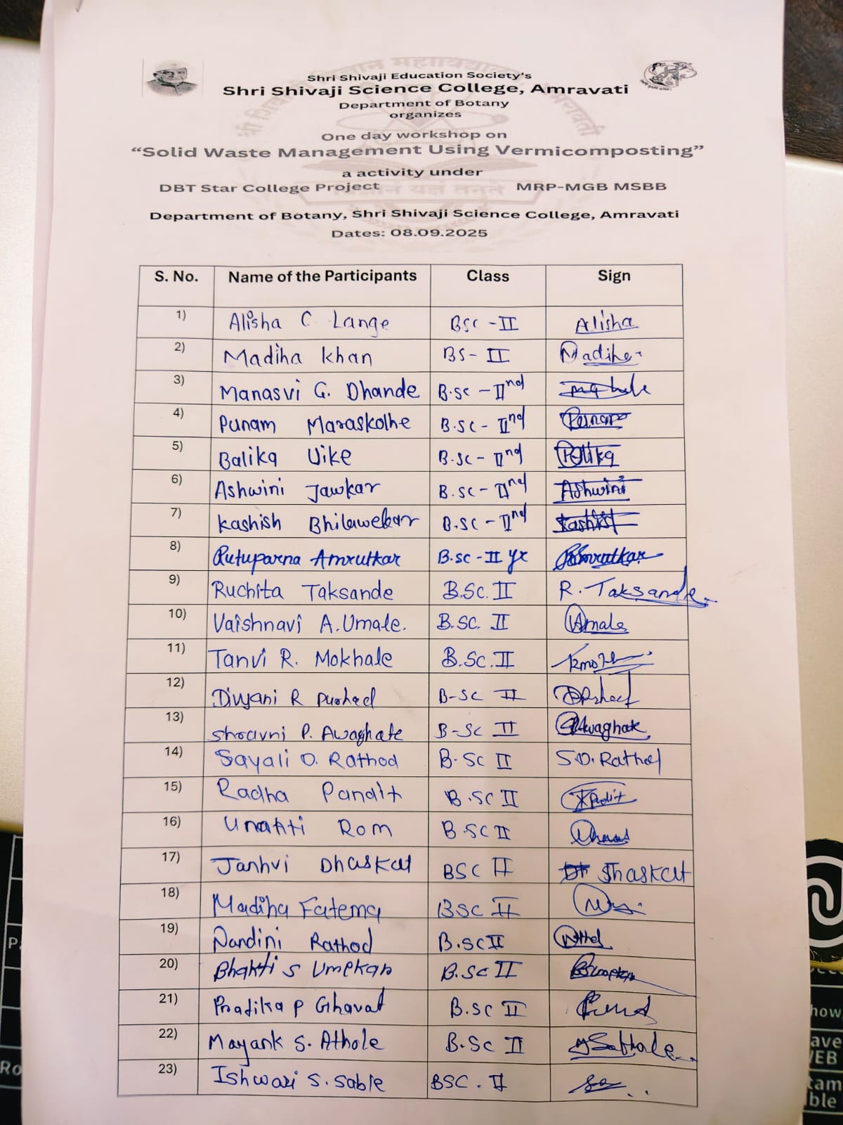 The Department of Botany, Shri Shivaji Science College, Amravati, organized a one-day workshop on “Solid Waste Management Using Vermicomposting” on 08 September 2025 as part of its extension activity for B.Sc. students. The program was conducted under the guidance of the Head of the Department, Dr. D. D. Khedkar, and was coordinated by Dr. A. S. Kale. A total of 30 students actively participated in the workshop, which was held in the Department of Botany. The activity was designed with the aim of creating awareness about sustainable waste management practices and equipping students with practical knowledge of vermicomposting techniques.