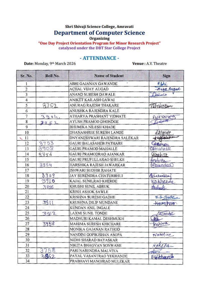 The Department of Computer Science & Application of Shri Shivaji Science College organized a One Day Project Orientation Program for Minor Research Project (MRP) on 9th March 2026 at 11:00 AM in the A.V. Theatre of the college. The program was conducted under the prestigious DBT Star College Initiative in collaboration with iBase Solutions Pvt. Ltd.. The primary aim of this activity was to provide guidance and orientation to final-year undergraduate students regarding their Minor Research Projects and to expose them to modern technological domains relevant to their academic and professional growth.