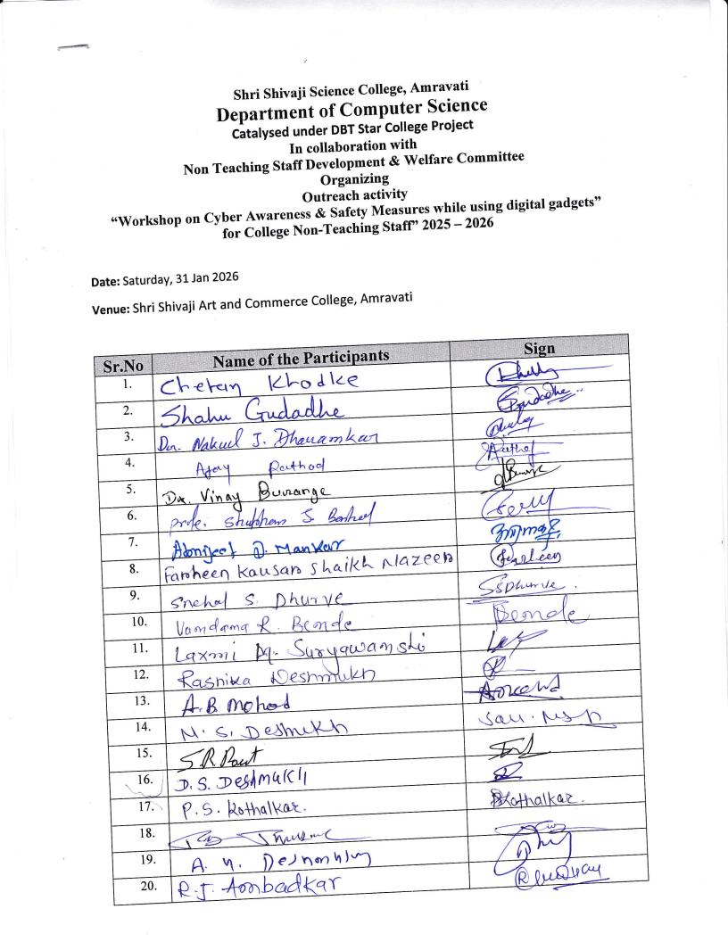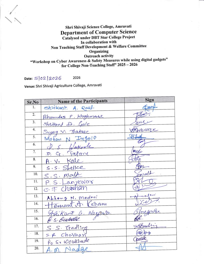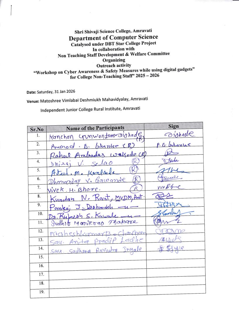 The workshop was organized by the Department of Computer Science, Shri Shivaji Science College, Amravati, under the DBT Star College Scheme (Strengthening Component), in collaboration with the Non-Teaching Staff Development and Welfare Committee (NTSDC).