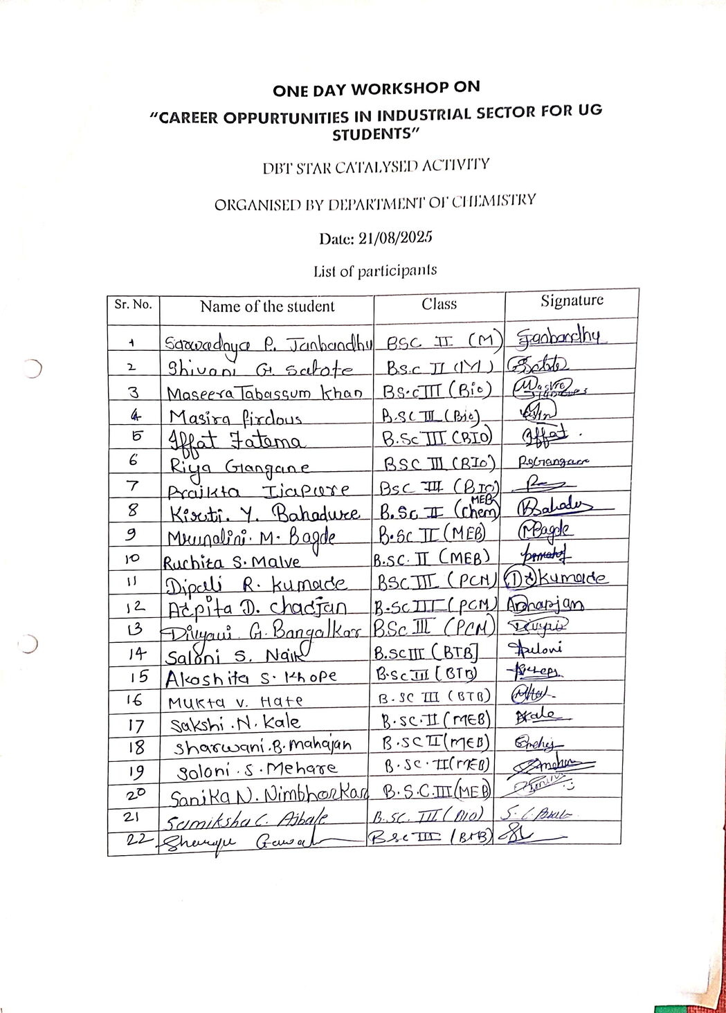 The Department of Chemistry, Shri Shivaji Science College, Amravati organized this online One Day National Workshop on “ Career Opportunities in Research and Industrial sector” for B.Sc.II and III year students on 21/08/2025 under the guidance of Dr G.V. Korpe, Principal, Shri Shivaji Science College Amravati. The workshop was inaugurated by Mr Jayant K. Indane ,Guest of Honor and Dr. P. R. Mandlik, Head. & Professor, Department of Chemistry. The National workshop was organized around a guest speakers Mr Jayant K. Indane, Pharma Professional. In order to design and run a successful workshop efforts were taken by the workshop Convener Dr. Anjali B. Bodade and Organizing Secretary Dr. Shrikant A. Wadhal.